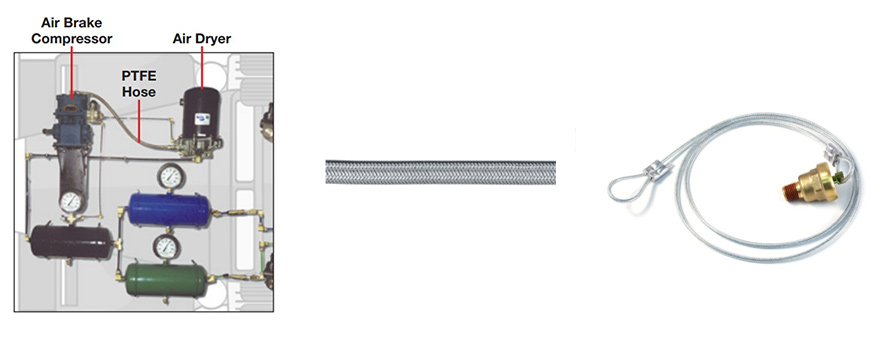 System sprężarki składa się z trzech komponentów: sprężarki, suszarki powietrza oraz węża łączącego lub rurki. Przepływ powietrza generowany przez sprężarkę nie może być używany, dopóki nie zostanie uwarunkowany. Istnieją dwa problemy z surowym sprężonym powietrzem. Po pierwsze, powietrze pochodzące ze sprężarki jest zbyt gorące dla standardowych rur. Wąż PTFE służy do podłączenia sprężarki do suszarki, ponieważ może obsługiwać temperatury do 400 ° F. Wąż PTFE można zidentyfikować za pomocą warkocza ze stali nierdzewnej, która służy zarówno jako pokrycie, jak i wzmocnienie.